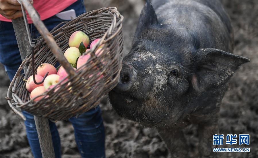 8月20日,康丹丹在接受采訪時(shí),一頭水果香豬來搶食她籃子里的海棠果。新華社記者 王昊飛 攝