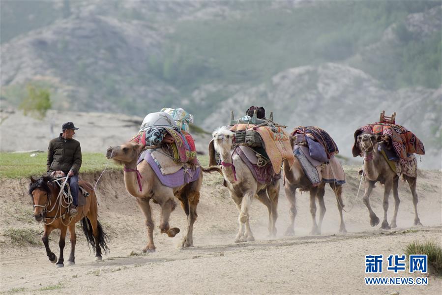 6月6日,新疆阿勒泰地區(qū)福??h牧民帶著駝隊行進在轉(zhuǎn)場途中。 新華社記者 丁磊 攝