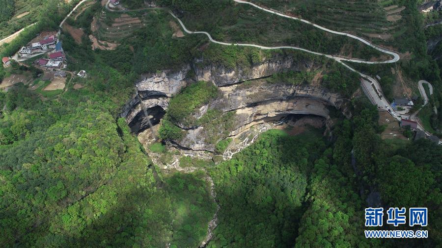 4月22日無(wú)人機(jī)拍攝的地洞河天坑。 新華社記者 張博文 攝