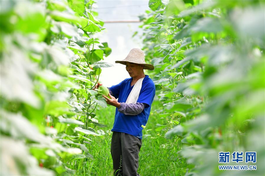 在廣西融安縣大良鎮(zhèn)古蘭村古蘭屯大棚基地,62歲的黃顯亮查看甜瓜生長情況(8月18日攝)。黃顯亮是大棚基地的技術員,每個月有3000多元的工資,已于2018年實現(xiàn)脫貧。 新華社記者 黃孝邦 攝
