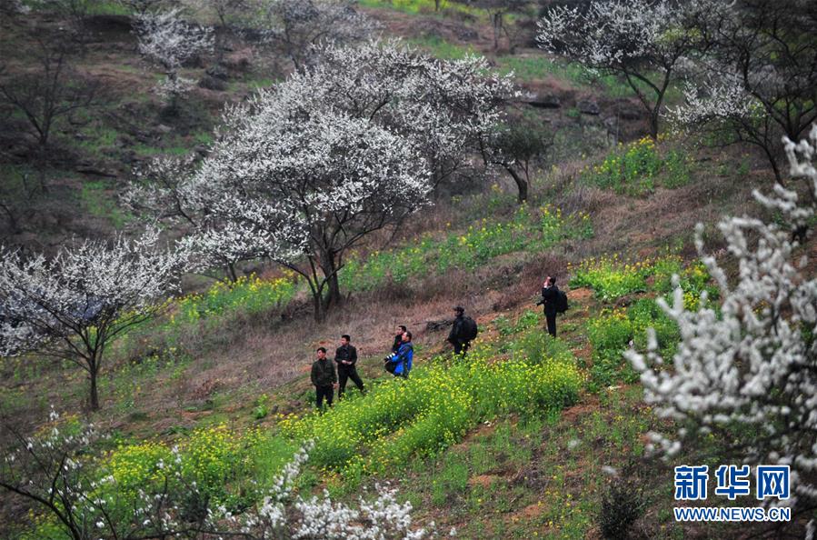 龍革雄(左二)帶著游客在銅板屯賞花(2014年2月21日攝)。新華社記者 黃孝邦 攝