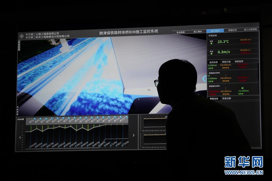 8月27日凌晨,施工人員在監(jiān)控橋梁轉體施工。 新華社記者 楊世堯 攝