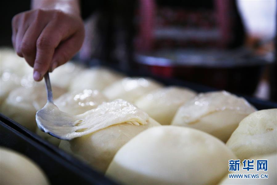 8月29日,付艷梅將發(fā)酵好的面團(tuán)揉捏成型。新華社記者淡航攝