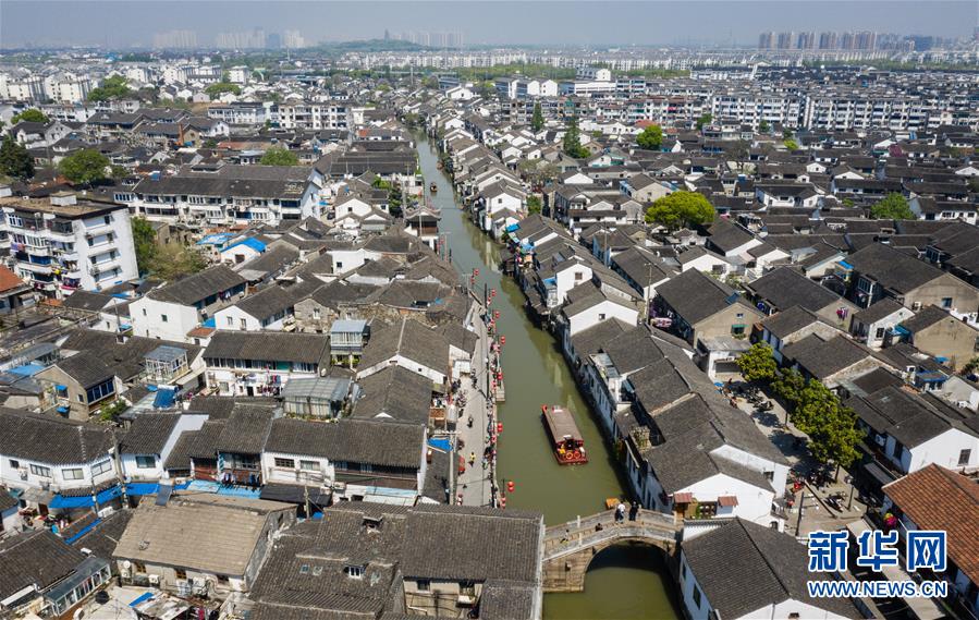 圖為4月18日無(wú)人機(jī)拍攝的蘇州山塘街及城景。 新華社記者 李響 攝