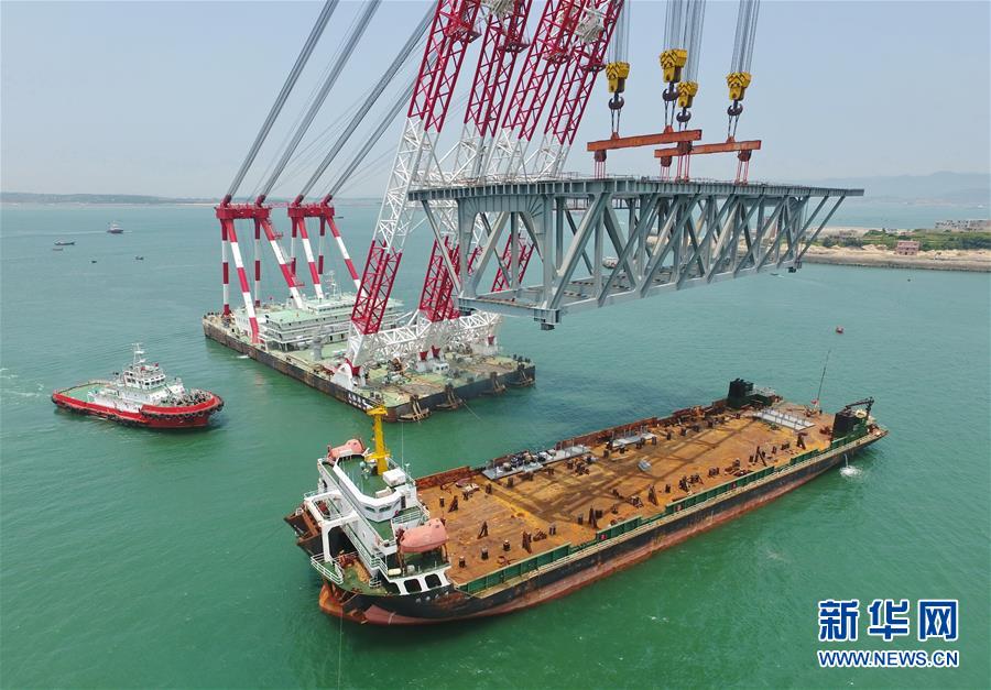 5月12日,“大橋海鷗號(hào)”起重船在吊裝一孔簡支鋼桁梁(無人機(jī)拍攝)。新華社記者林善傳攝