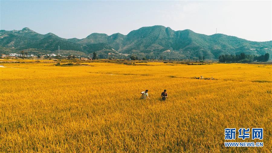 這是9月30日無人機拍攝的河北省涉縣白芟村的稻田。 近日,位于太行山下的河北省涉縣白芟村上千畝水稻逐漸成熟。從空中俯瞰,猶如一塊塊“調(diào)色盤”,美不勝收。 新華社記者 王曉 攝