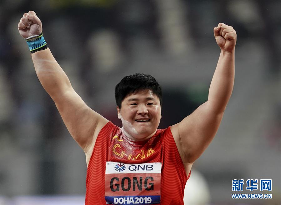 當(dāng)日,在卡塔爾多哈舉行的2019國(guó)際田聯(lián)世界田徑錦標(biāo)賽女子鉛球決賽中,衛(wèi)冕冠軍、中國(guó)選手鞏立姣以19米55的成績(jī)奪得冠軍。 新華社記者賈宇辰攝