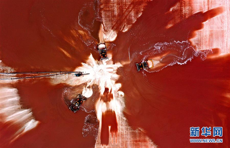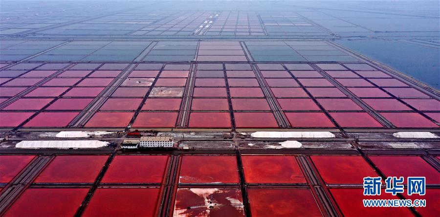 日前,山東省無棣縣境內的魯北鹽場進入海鹽收獲季節(jié),星羅棋布的鹽池將大地裝扮得繽紛如畫。無棣縣位于山東省北部渤海之濱,全縣擁有鹽田365萬公畝,是我國重要的海鹽生產基地。據(jù)無棣縣工信局統(tǒng)計,今年1-9月份,當?shù)卦}產量111.7萬噸。