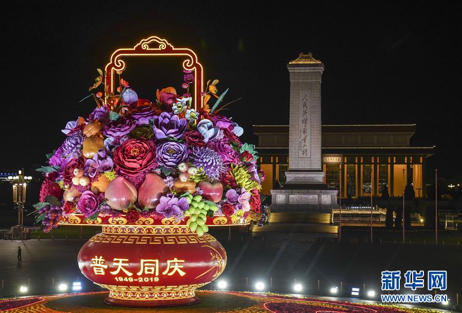 這是10月14日拍攝的天安門(mén)廣場(chǎng)中心花壇。 10月14日,以“花果籃”為主造型的天安門(mén)廣場(chǎng)中心花壇吸引了眾多游客參觀拍照?!盎ü@”的夜景更是流光溢彩,絢爛迷人。 新華社記者 殷剛 攝