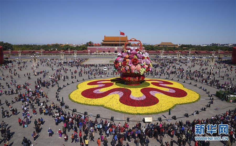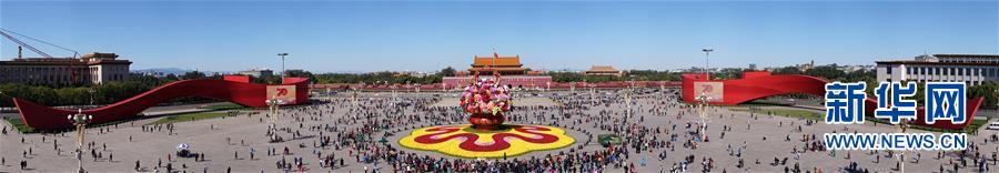 這是10月14日拍攝的天安門(mén)廣場(chǎng)中心花壇(全景拼接圖片)。 10月14日,以“花果籃”為主造型的天安門(mén)廣場(chǎng)中心花壇吸引了眾多游客參觀拍照?!盎ü@”的夜景更是流光溢彩,絢爛迷人。 新華社記者 殷剛 攝