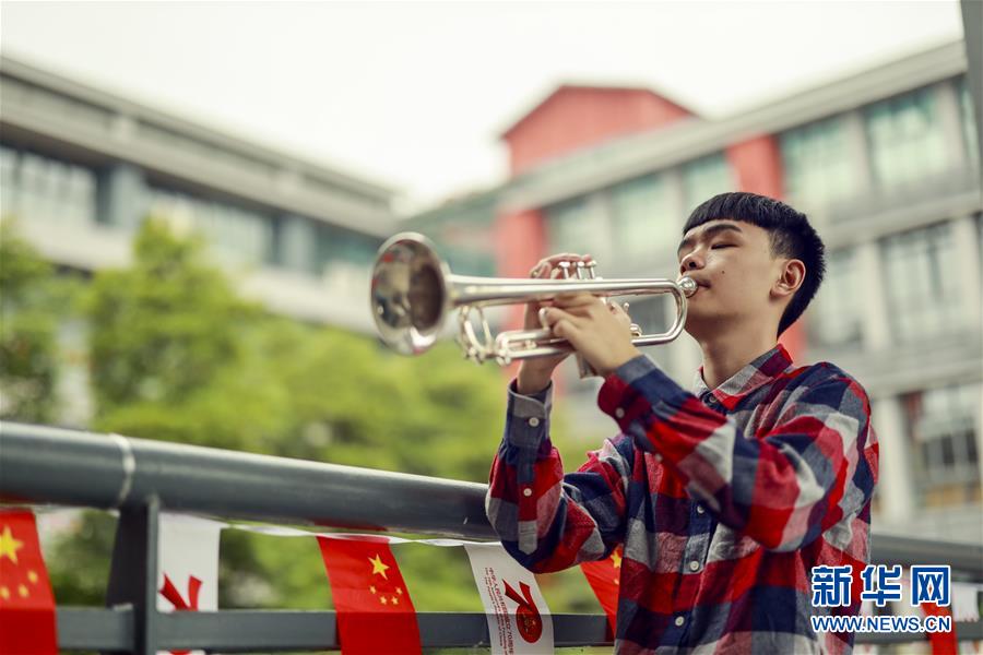王太樊在教室外的樓道給自己心愛的小號試音(10月10日攝)。 新華社記者 劉潺 攝