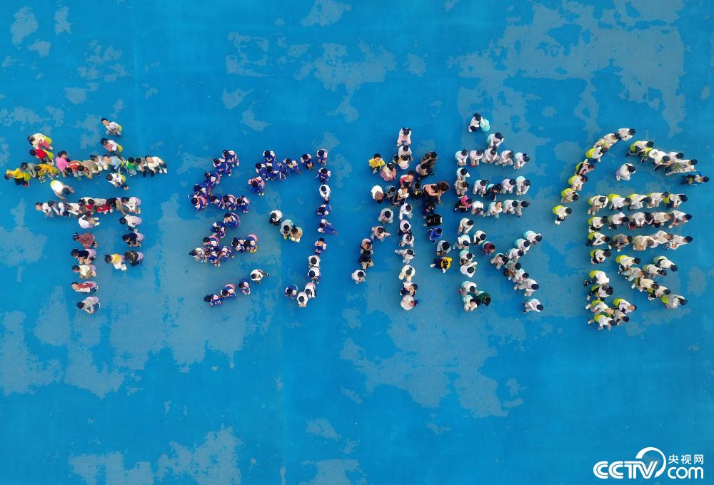 2019年10月15日,浙江金華,武義縣武陽幼兒園的小朋友在操場排成“節(jié)約糧食”四個大字,倡導(dǎo)節(jié)儉新風(fēng)尚。圖片來源:視覺中國