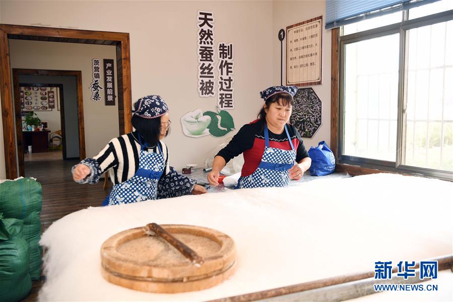 10月16日,團(tuán)結(jié)村的“巧媳婦”龔粉珍(右)和張會(huì)敏在制作蠶絲被。  新華社記者 楊宗友 攝