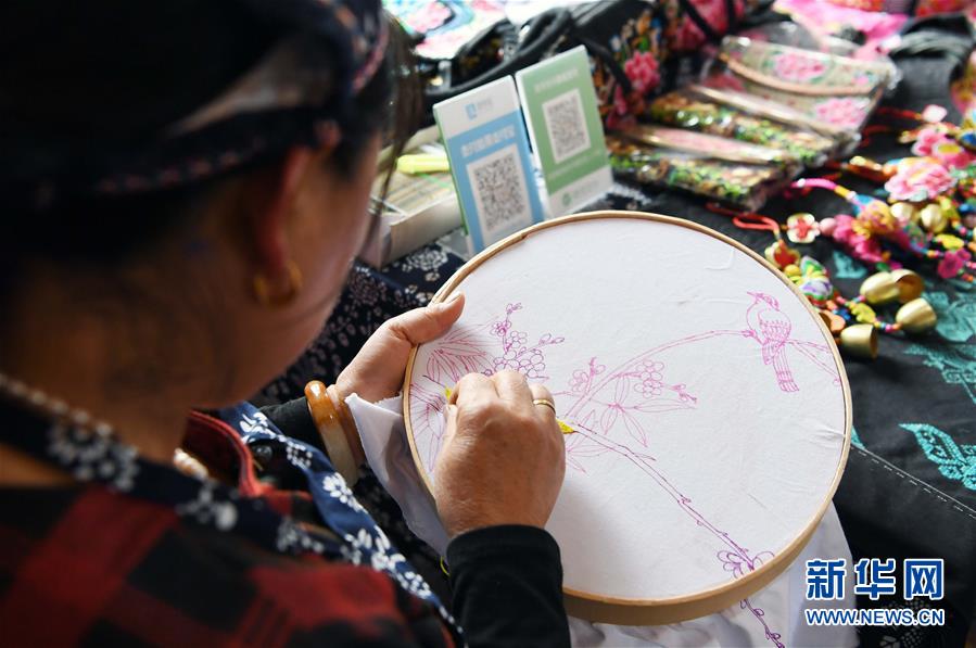 10月16日,團(tuán)結(jié)村的一名“巧媳婦”在刺繡。 新華社記者 楊宗友 攝