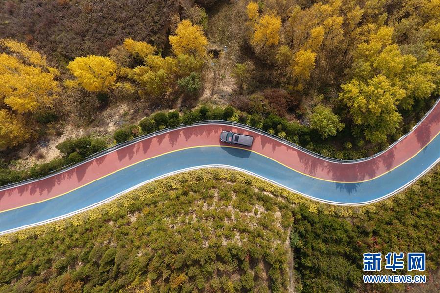 車(chē)輛行駛在山西省太原市西山旅游公路上(10月22日無(wú)人機(jī)拍攝)。