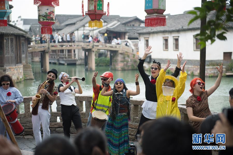10月26日,一個劇團(tuán)在烏鎮(zhèn)街頭表演。 新華社記者翁忻旸攝