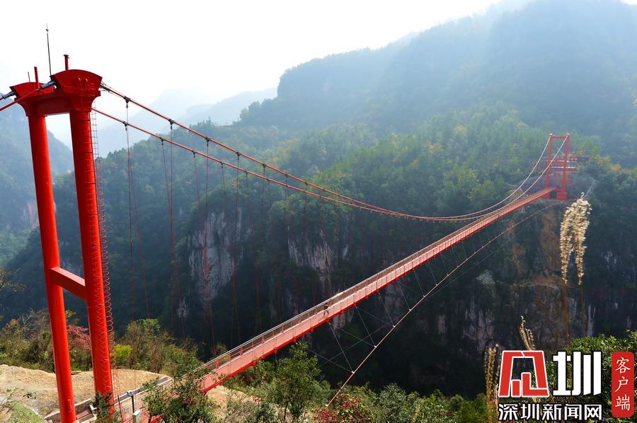 2017年11月5日,游客走在湖北省保康縣歇馬鎮(zhèn)九路寨景區(qū)戰(zhàn)口河人行懸索橋上觀光。