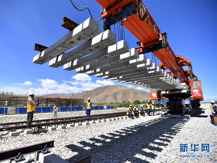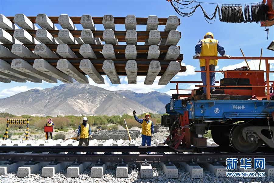6月6日,負(fù)責(zé)鋪軌的中鐵十一局集團(tuán)的建設(shè)者在現(xiàn)場(chǎng)作業(yè)。新華社記者普布扎西攝