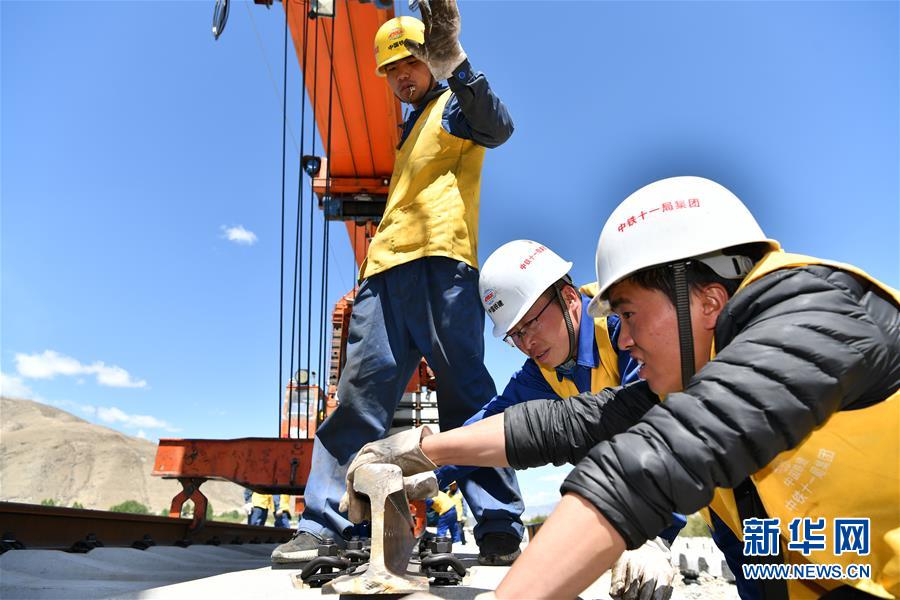 6月6日,負(fù)責(zé)鋪軌的中鐵十一局集團(tuán)的建設(shè)者在現(xiàn)場(chǎng)作業(yè)。新華社記者李鑫攝