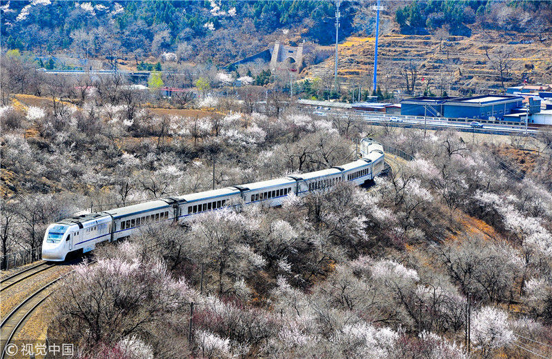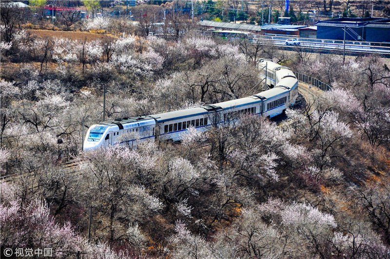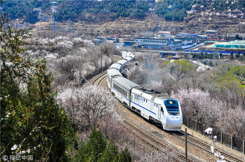 2019年3月22日,北京居庸關(guān)附近的山花盛開,S2線列車穿行在花海之中,構(gòu)成一幅美麗的畫面。時(shí)永平/千龍圖像/視覺中國編輯/陳進(jìn)