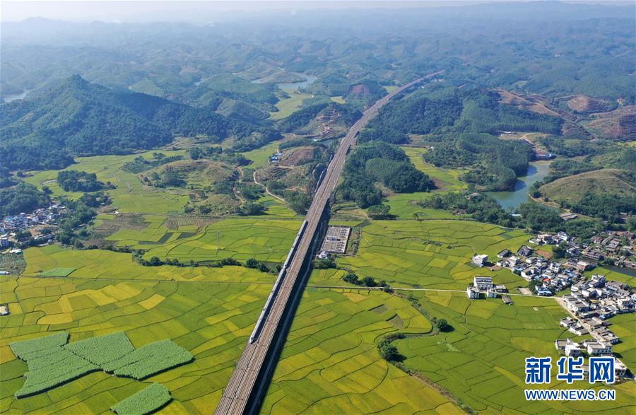 10月29日,列車從廣西賓陽縣古辣鎮(zhèn)豐收的稻田間駛過(無人機(jī)拍攝)。新華社記者陸波岸攝
