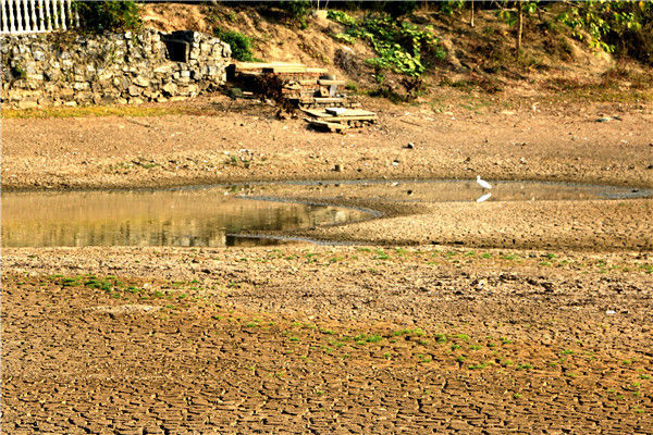 2019年10月4日,江西彭澤縣黃嶺鄉(xiāng)芳湖村,池塘干枯見(jiàn)底。圖為一只蒼鷺在干枯的池塘覓水。