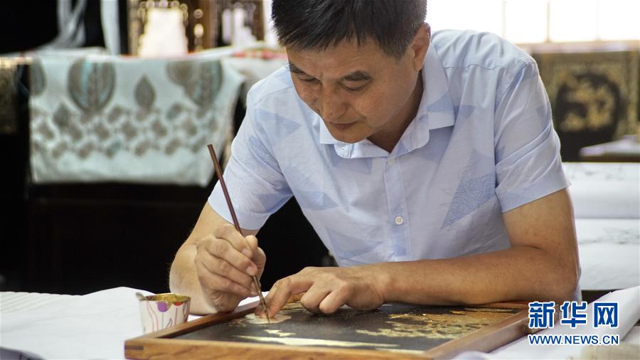 北京金漆鑲嵌有限責任公司工藝美術(shù)大師敖明在創(chuàng)作描金漆畫(10月31日攝)。新華社記者李欣攝
