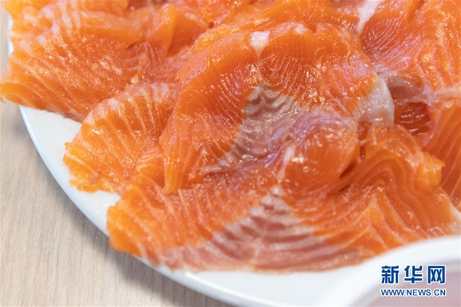 這是9月13日在俄羅斯摩爾曼斯克以北的巴倫支海域的鮭魚養(yǎng)殖場(chǎng)拍攝的鮭魚肉片。 新華社記者白雪騏攝