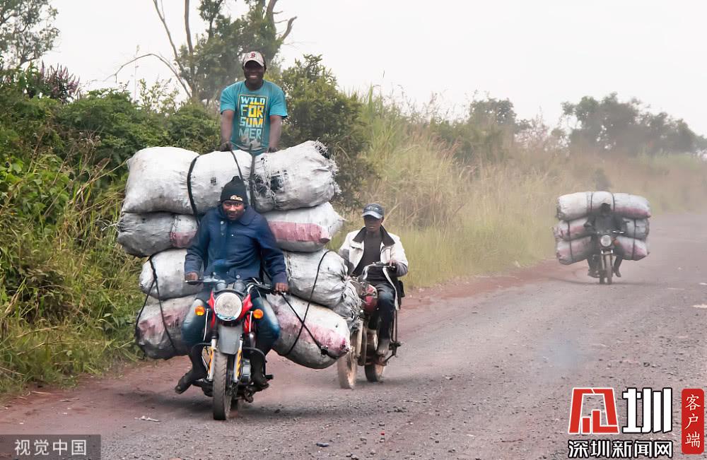 剛果,工人們將裝滿木炭的麻袋放在摩托車上,從維龍加國(guó)家公園運(yùn)到剛果戈馬市。
