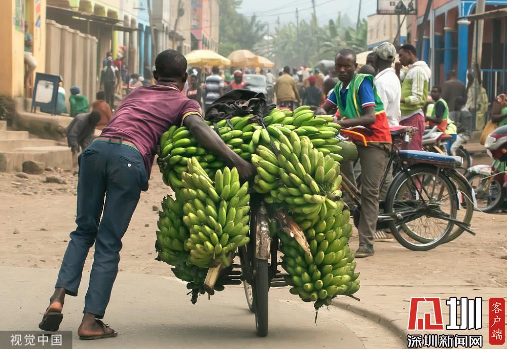 剛果,工人們將香蕉放在自行車上運往市場。