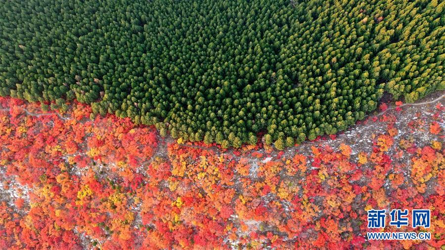 火紅的黃櫨樹(shù)林與綠色的松林沿濟(jì)南蝎子山山脊分布(11月4日無(wú)人機(jī)拍攝)。  新華社記者 朱崢 攝