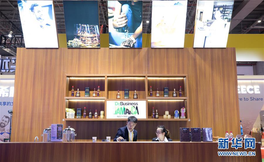 11月5日,工作人員在牙買加國(guó)家館整理展品。新華社記者金立旺攝
