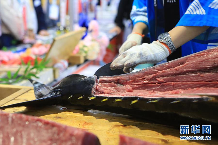 11月7日,來自日本長崎魚市株式會(huì)社的專業(yè)切魚師傅在現(xiàn)場(chǎng)解體70公斤藍(lán)鰭金槍魚。第二屆中國國際進(jìn)口博覽會(huì)正在上海國家會(huì)展中心舉行。博覽會(huì)的食品及農(nóng)產(chǎn)品展區(qū)里匯集了來自世界各地的美食,同時(shí)也上演各種精彩美食秀。11月7日,來自日本長崎魚市株式會(huì)社的專業(yè)切魚師傅現(xiàn)場(chǎng)解體一條70公斤的藍(lán)鰭金槍魚,吸引大量參觀者觀看、品嘗。新華社記者隋先凱攝