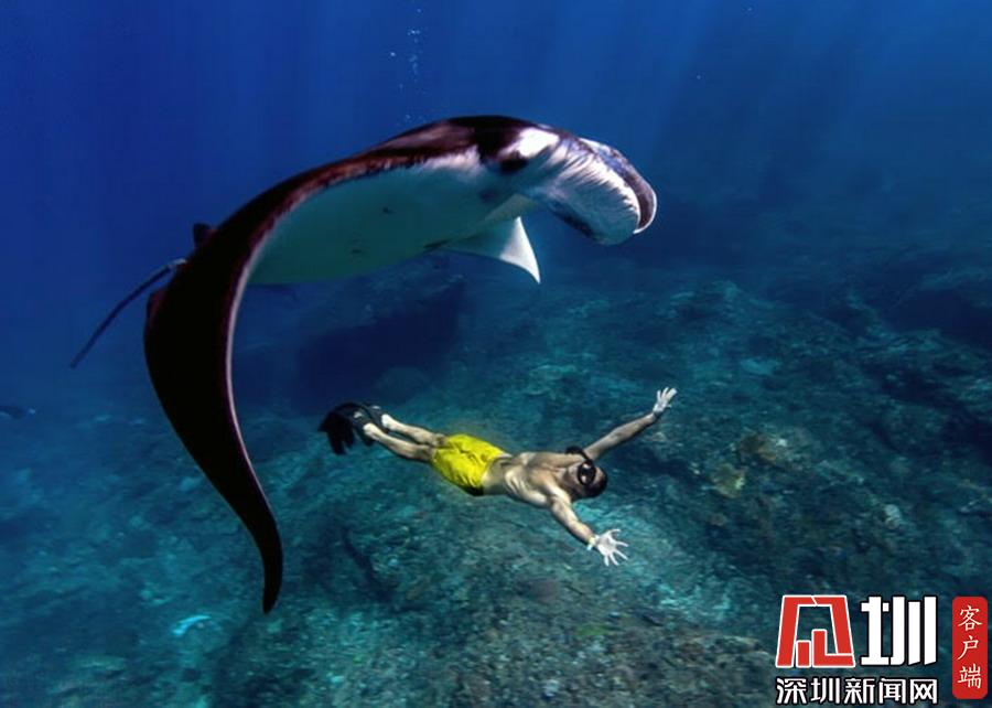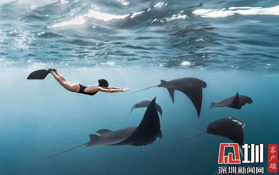 2019年7月2日?qǐng)?bào)道(具體拍攝時(shí)間不詳),印度尼西亞科莫多國家公園,美國自由潛水愛好者Kristina Zvaritch一次潛水時(shí),她的正下方恰巧游著幾只巨大的蝠鲼,這令人驚艷的一幕恰巧被她的丈夫拍下來了。當(dāng)她看到這些照片時(shí),自己都被驚呆了。晶瑩剔透的海水使這張照片有了視覺錯(cuò)位的效果,讓人以為Kristina與這些魚處于相同的高度,但實(shí)際上她離這些魚還有10-19英尺左右的距離。