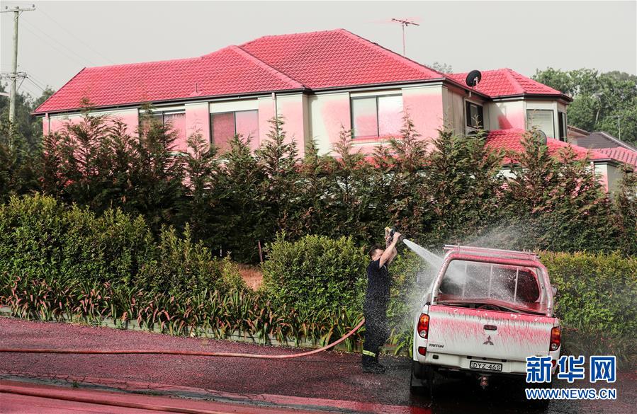 11月12日,在澳大利亞悉尼附近的南塔勒馬拉,消防員在滅火后清洗車輛上的滅火劑。新華社記者白雪飛攝