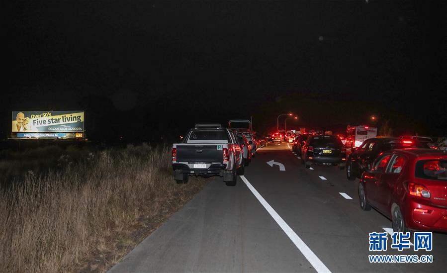11月10日夜間,在澳大利亞新南威爾士州塔里附近道路上,由于山火封路,當(dāng)?shù)鼐用耨{車排隊(duì)等待前往避難所。新華社記者白雪飛攝