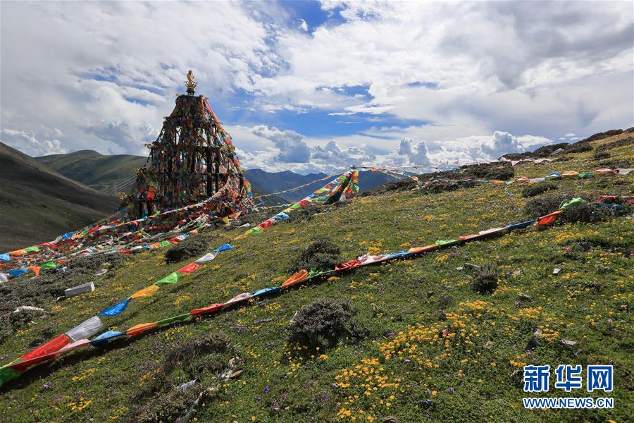 在川藏公路四川折多山埡口,藍天白云與經(jīng)幡、草地、鮮花構成一幅美麗畫卷(6月28日攝)。新華社記者江宏景攝