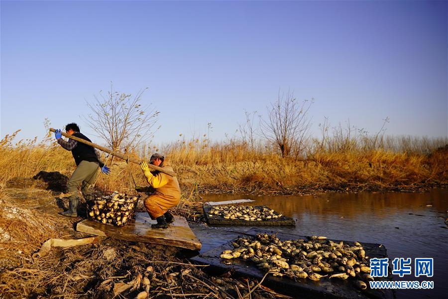 11月18日,工人在采收蓮藕。初冬時節(jié),河北省唐山市曹妃甸蓮藕豐收,工人們在結(jié)冰之前忙著采收蓮藕。新華社記者楊世堯攝