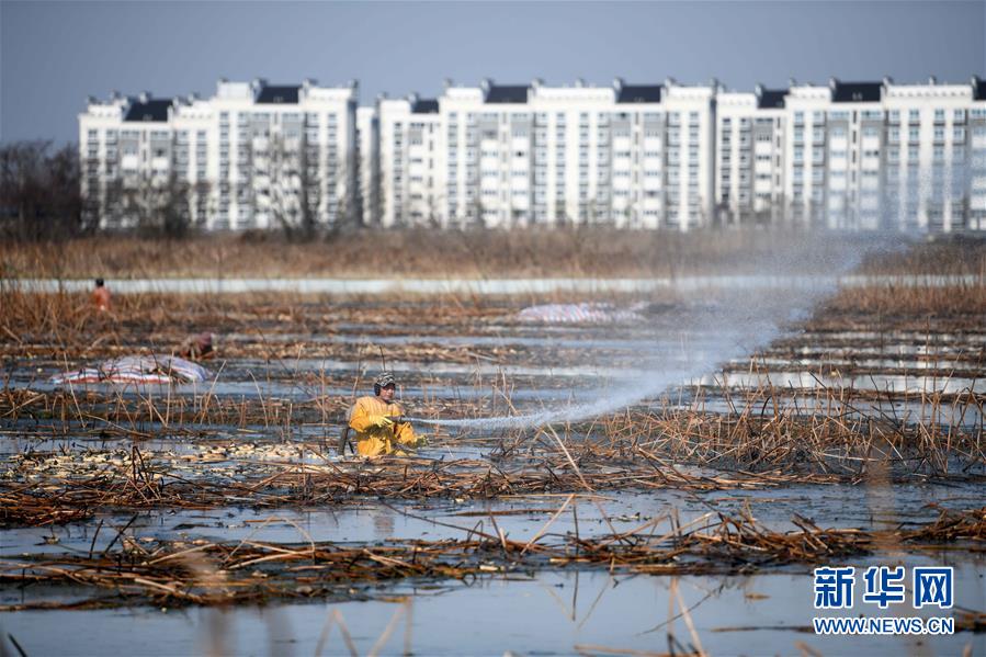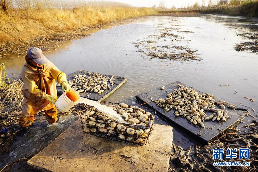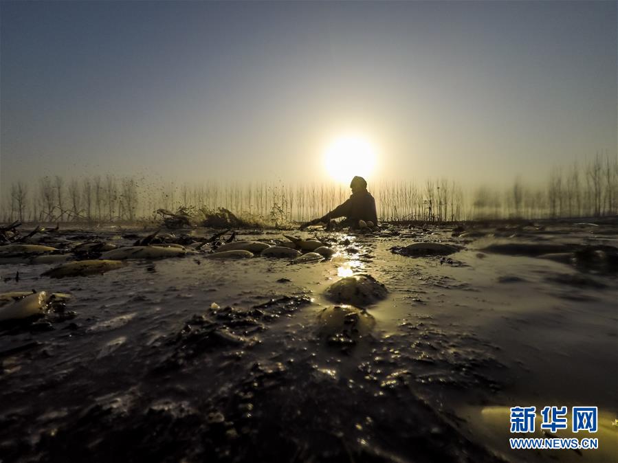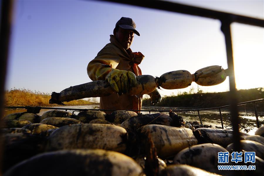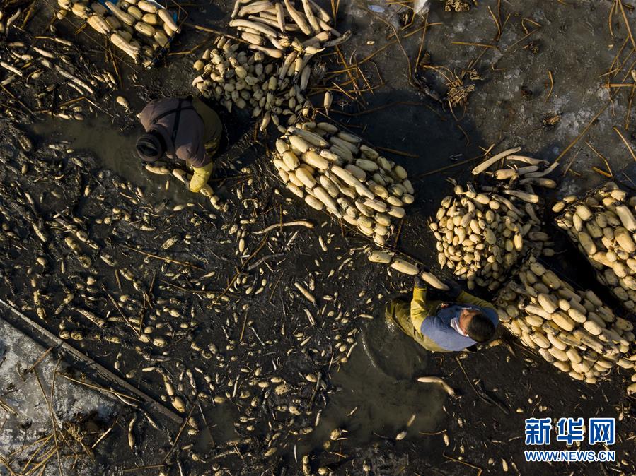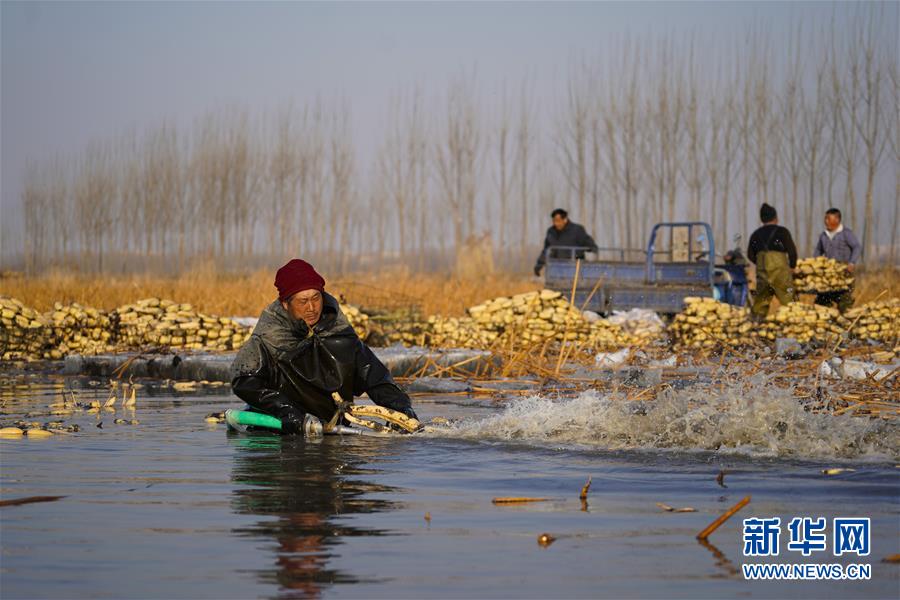 11月18日,工人在采收蓮藕。初冬時(shí)節(jié),河北省唐山市曹妃甸蓮藕豐收,工人們在結(jié)冰之前忙著采收蓮藕。新華社記者邢廣利攝