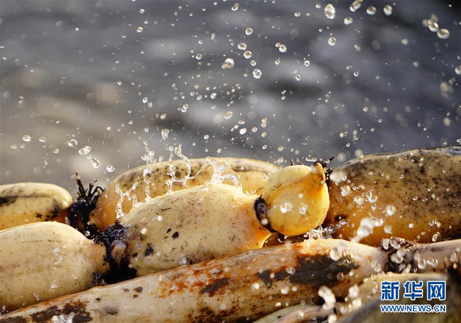 11月18日拍攝的蓮藕。初冬時(shí)節(jié),河北省唐山市曹妃甸蓮藕豐收,工人們在結(jié)冰之前忙著采收蓮藕。新華社記者邢廣利攝