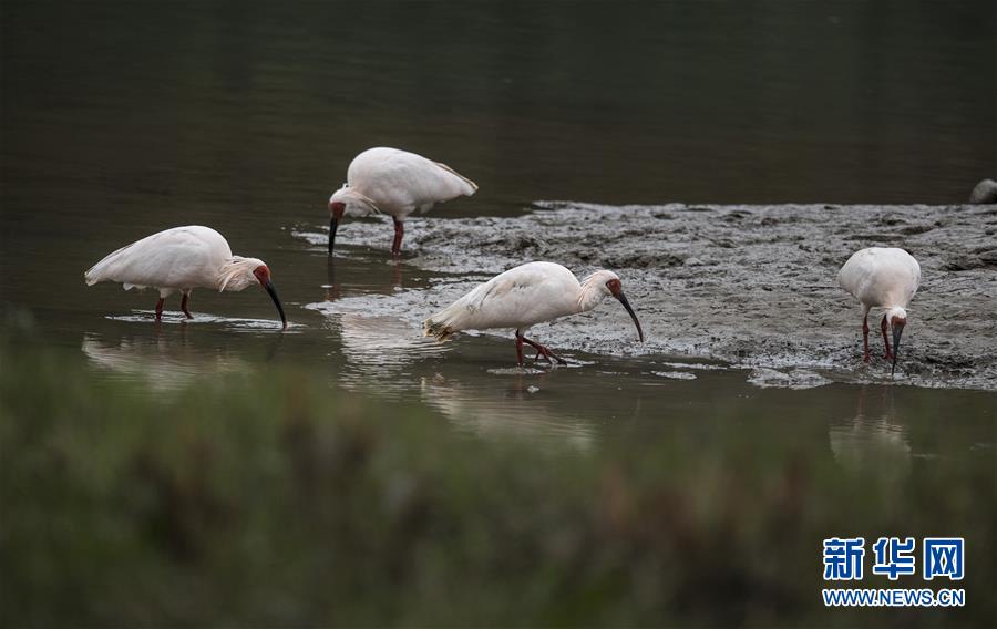 11月19日,朱鹮在陜西省漢中市西鄉(xiāng)縣峽口鎮(zhèn)井壩村牧馬河里覓食。 新華社記者陶明攝