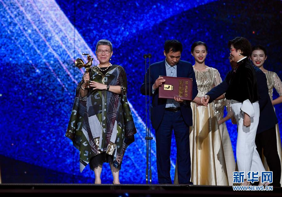 11月23日,最佳中小成本故事片獎獲獎電影《紅花綠葉》導(dǎo)演劉苗苗(左一)出席頒獎典禮。 當日,第32屆中國電影金雞獎頒獎典禮在福建廈門舉行。 新華社記者姜克紅攝