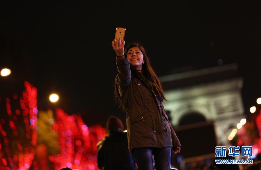 11月24日,在法國(guó)巴黎,一名女子在香榭麗舍大街點(diǎn)燈儀式上留影。當(dāng)日,法國(guó)巴黎香榭麗舍大街點(diǎn)亮彩燈迎圣誕。從即日起至1月8日,整條香榭麗舍大街都將被喜慶的節(jié)日燈飾點(diǎn)亮。新華社記者高靜攝