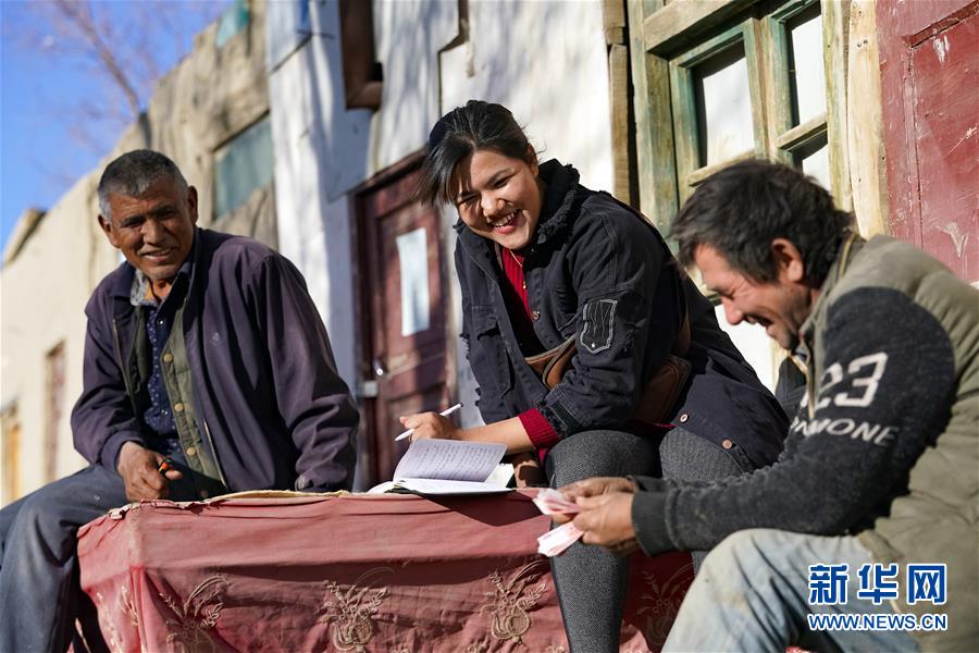 在地處塔克拉瑪干沙漠腹地的新疆于田縣達(dá)里雅布依鄉(xiāng),庫(kù)爾班罕·買提肉孜(中)與養(yǎng)羊合作社的合作伙伴結(jié)算購(gòu)買羊肉的費(fèi)用(11月13日攝)。
