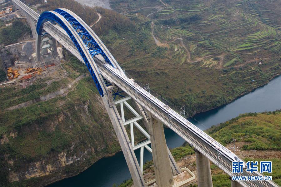 12月2日,一輛試驗列車駛過成貴高鐵鴨池河特大橋。新華社記者劉續(xù)攝