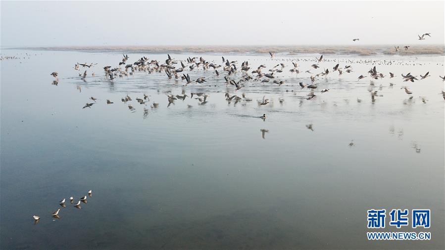 12月7日,一群候鳥在升金湖上空飛翔(無人機(jī)拍攝)。新華社記者張端攝