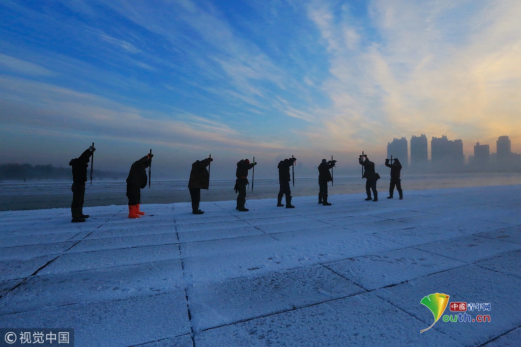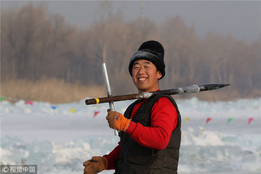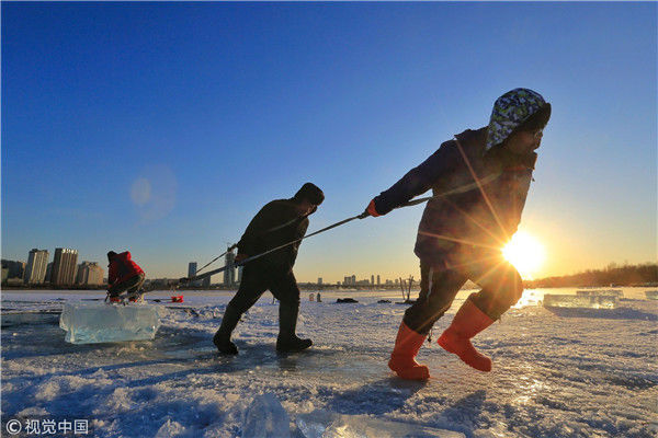 2018年12月11日,黑龍江省哈爾濱市,松花江上,采冰者們彎腰拉繩,宛如纖夫般拽重達(dá)半噸的冰塊出水。采冰者都是自哈市江北萬寶、東發(fā)、沙陀子等鄉(xiāng)鎮(zhèn)的農(nóng)民,他們每年冬閑時都會親屬、村鄰之間結(jié)伴到松花江畔采冰,有的采冰人,已經(jīng)連續(xù)干了二十多年。每個采冰季,他們每天要在冰面上工作10-12個小時,每個采冰組,一天要拽出冰塊2000-3000塊,一個近20天的采冰季,每人能收入近萬元。視覺中國