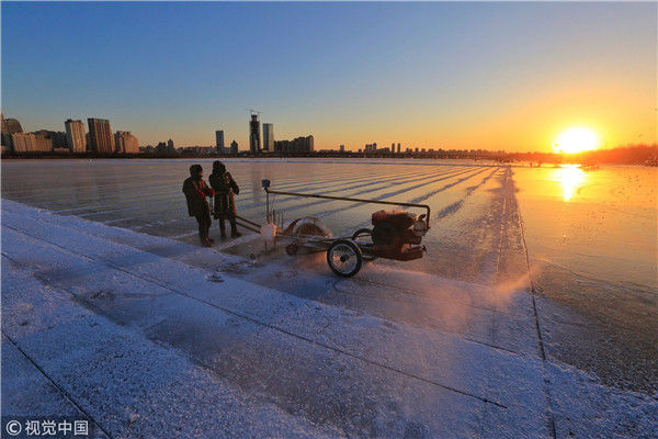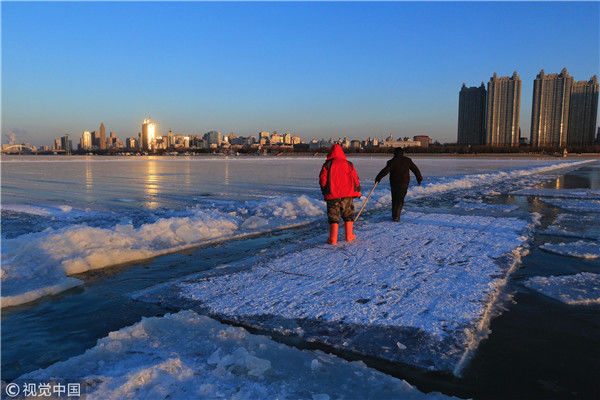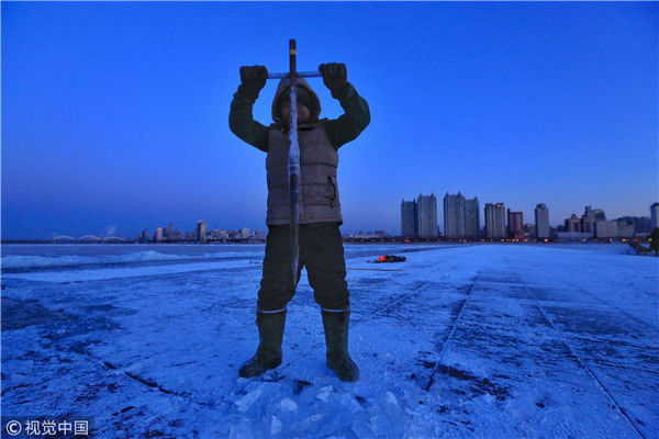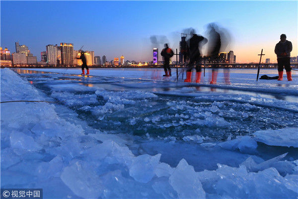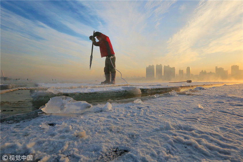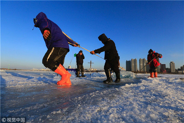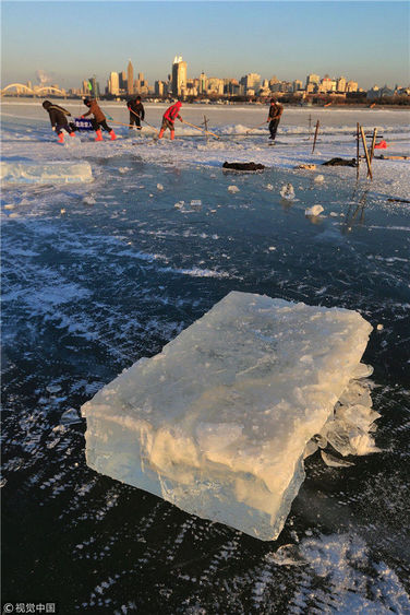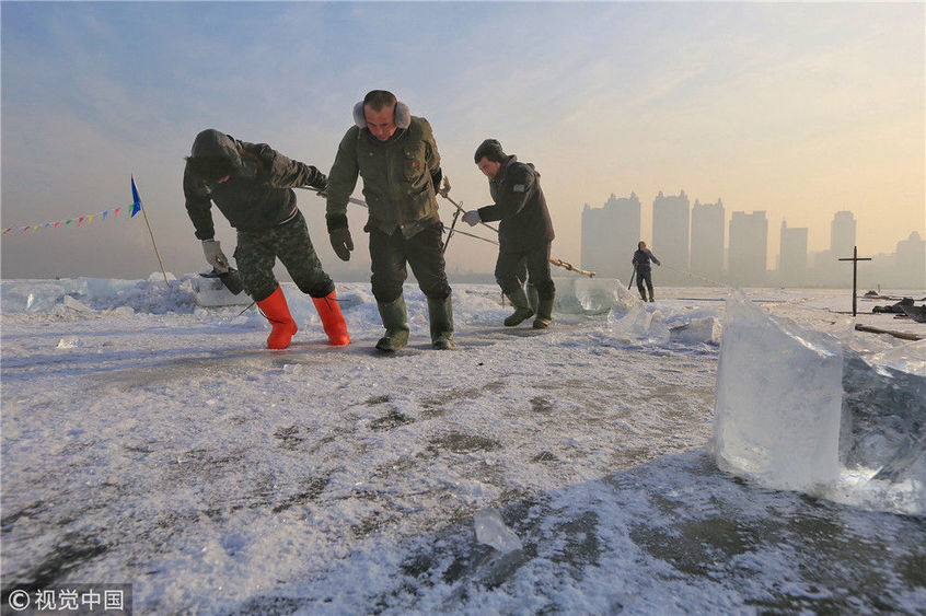 2018年12月8日,最低氣溫零下22度,哈爾濱市江北公路大橋東側(cè)的江面上,工人們正在從江中撈取冰塊,裝車運(yùn)往景區(qū)制作冰燈、冰雕?,F(xiàn)場,工人先是用電鋸、鐵釬將冰分割成半米多寬,一米多長的冰塊,接著將其拉出水面。等候在旁的叉車上前,將冰裝上運(yùn)冰的卡車,之后裝滿冰塊的卡車駛往景區(qū)。