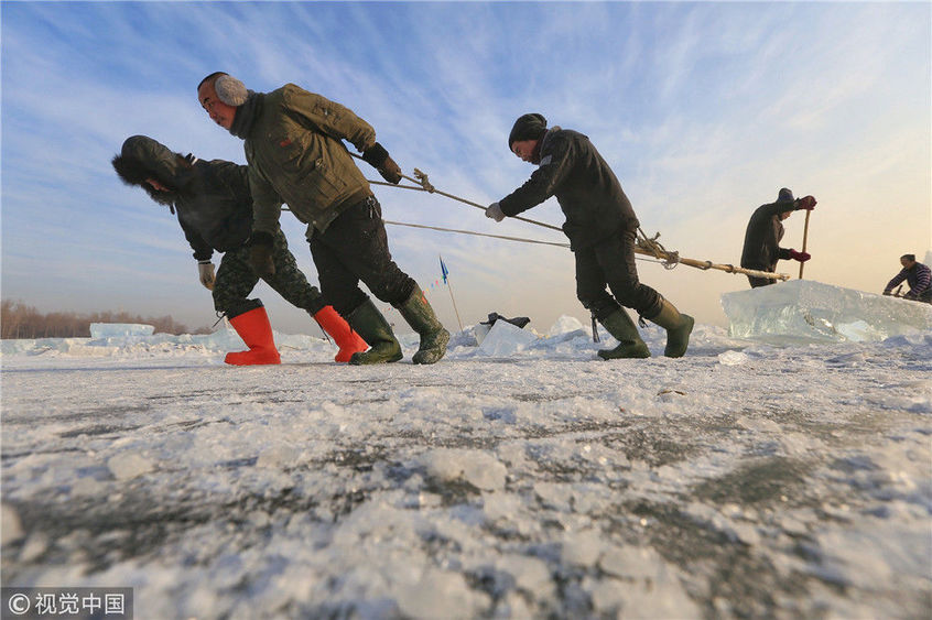 2018年12月11日,黑龍江省哈爾濱市,松花江上,采冰者們彎腰拉繩,宛如纖夫般拽重達(dá)半噸的冰塊出水。采冰者都是自哈市江北萬寶、東發(fā)、沙陀子等鄉(xiāng)鎮(zhèn)的農(nóng)民,他們每年冬閑時都會親屬、村鄰之間結(jié)伴到松花江畔采冰,有的采冰人,已經(jīng)連續(xù)干了二十多年。每個采冰季,他們每天要在冰面上工作10-12個小時,每個采冰組,一天要拽出冰塊2000-3000塊,一個近20天的采冰季,每人能收入近萬元。