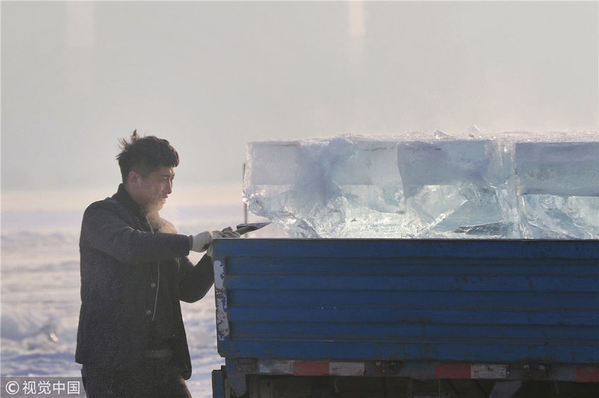 2018年12月11日,黑龍江省哈爾濱市,松花江上,采冰者們彎腰拉繩,宛如纖夫般拽重達半噸的冰塊出水。采冰者都是自哈市江北萬寶、東發(fā)、沙陀子等鄉(xiāng)鎮(zhèn)的農(nóng)民,他們每年冬閑時都會親屬、村鄰之間結(jié)伴到松花江畔采冰,有的采冰人,已經(jīng)連續(xù)干了二十多年。每個采冰季,他們每天要在冰面上工作10-12個小時,每個采冰組,一天要拽出冰塊2000-3000塊,一個近20天的采冰季,每人能收入近萬元。